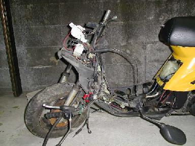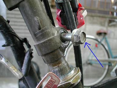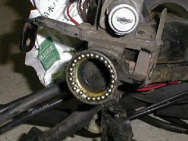 外したらもうそのまま前輪の部分が引っこ抜けます。 その時にスピードメーターのワイヤーとブレーキのワイヤーは外しておきましょう。 スピードメーターのワイヤーは付け根にピンがあるのでそれをペンチで外せばそのまま引っこ抜けます。 外す時にボールベアリングの玉がポロポロ落ちていくので無くさないようにしよう!! |