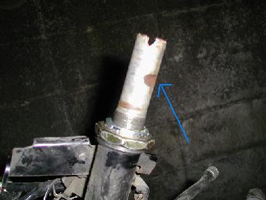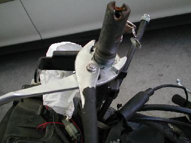 ハンドルを外したら上の写真を見たら分かると思うけど、丸いナットをはずします。 これは専用工具がいるけど、こんなのでいちいちバイク屋に頼むのはめんどくさいのでその辺にある大きめの安物プライヤーで気合いではずせます。 はずしたら下のでっかいナットもプライヤーで外します。 CRC556みたいな潤滑油塗ったほうがいいかも |